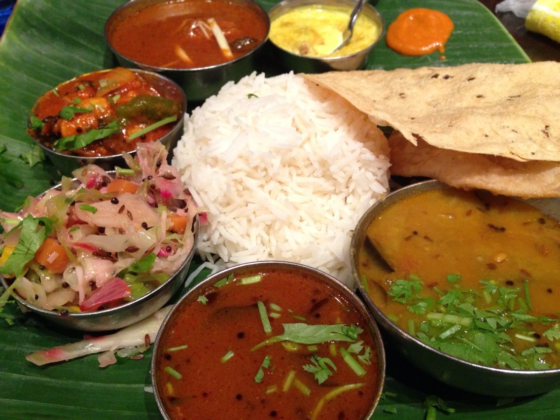 右手前から時計回りに、サンバル、ラッサム、炒めた野菜のカレー、海老カレー、チキンカレー、デザート。