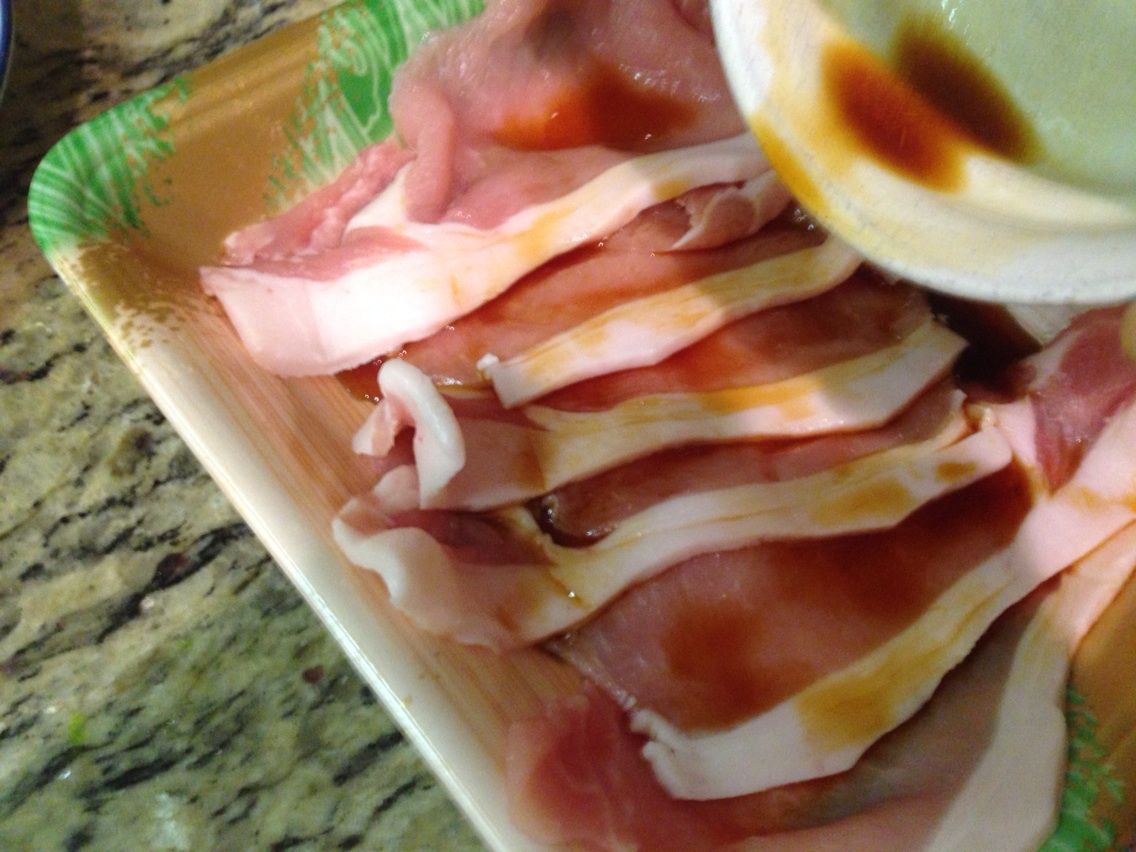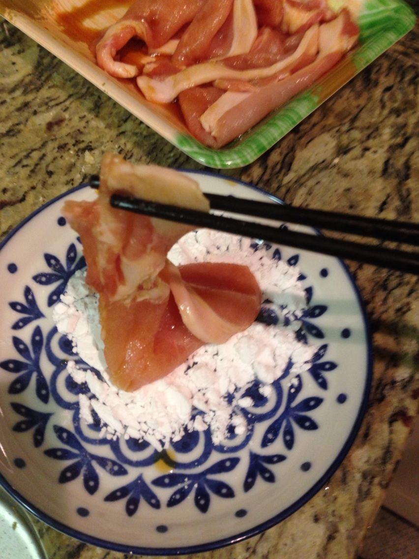 3.フライパンに油を敷いて熱しながら、豚肉に片栗粉をつけるよ!