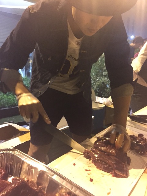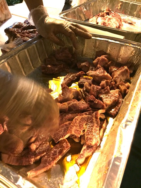 このBBQは、写真右手のキッチンテーブルで肉を切ったり下味つけたりしつつ、客席はその肉を貰いに行って自分たちで焼くスタイル!