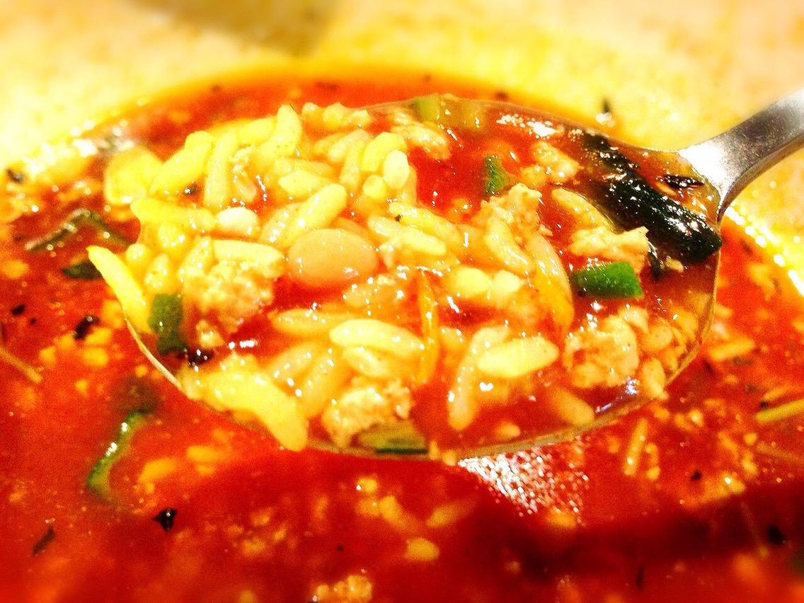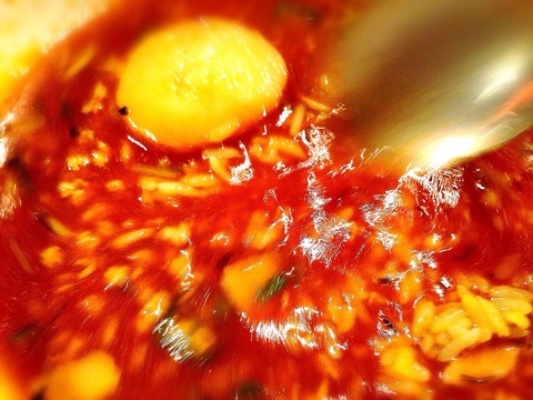 カレーマンは、オリジナルスープにトマトをプラスした赤に、ひき肉納豆にしたよ!