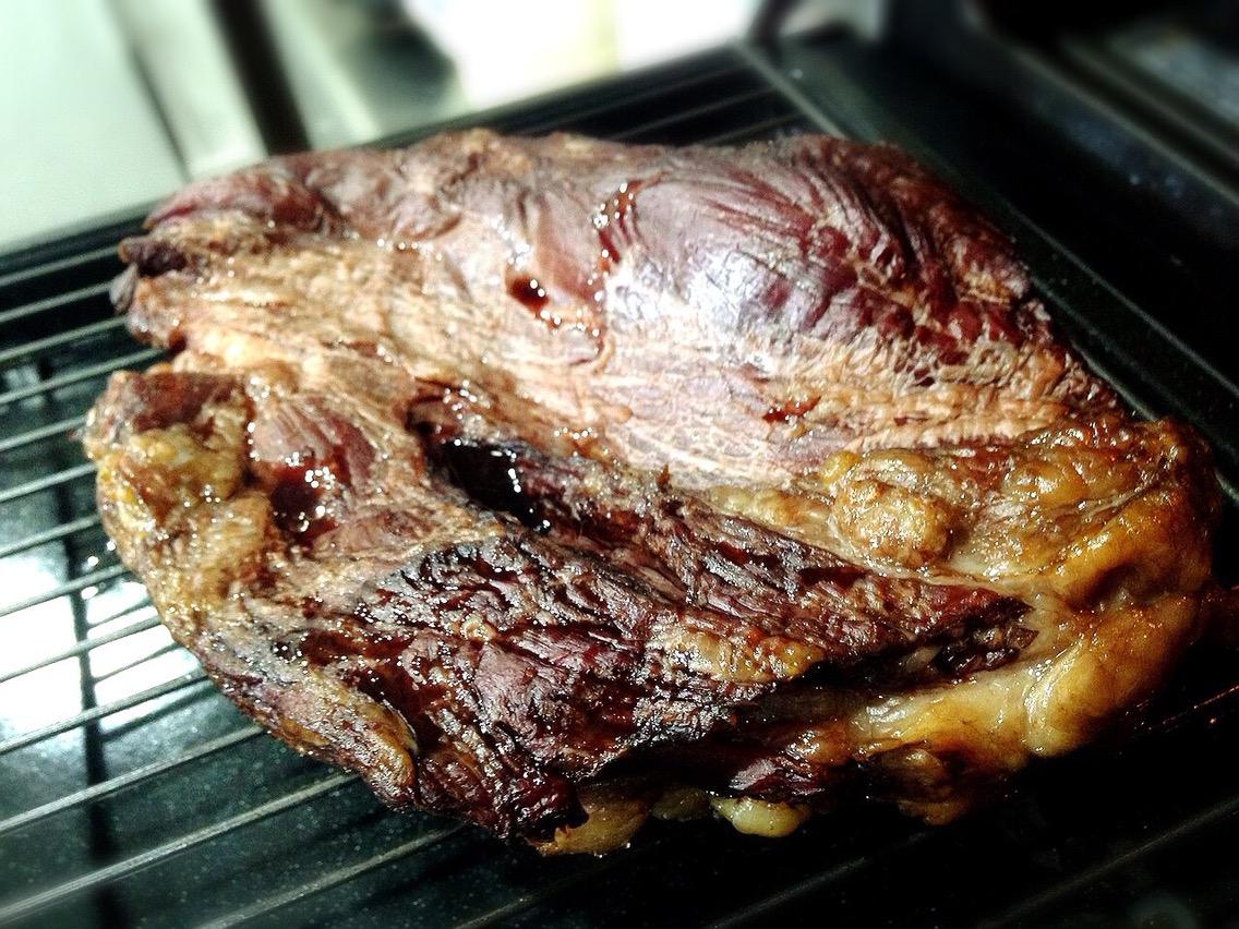 低温オーブンでじっくり熱を加えたあとは、フライパンで表面をガツンと焼くよ!