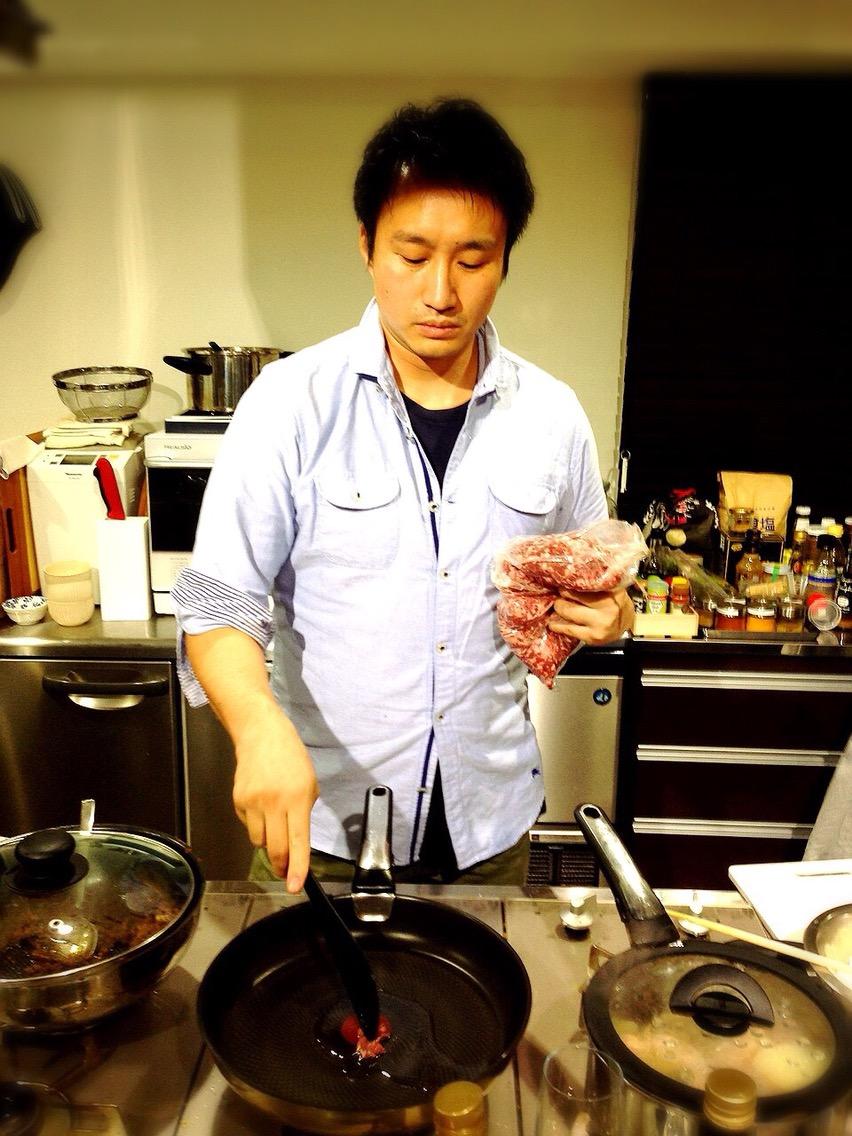 挽肉片手に火加減をチェックするこのおじさんは、味覚コンサルタントの菅慎太郎さん!