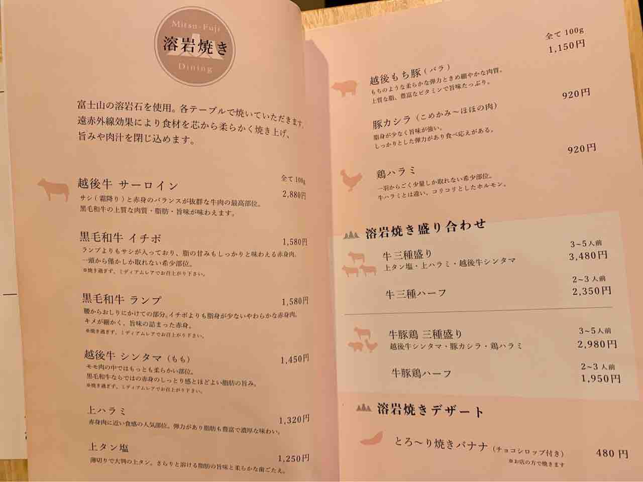 メニューのアタマには、契約牧場から直送されるという和牛の溶岩焼きがズラリ!!