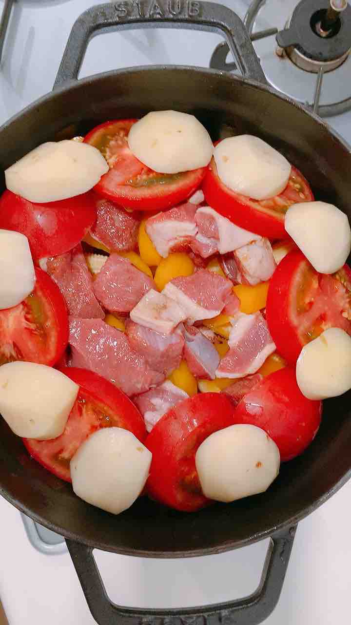 タジン鍋が無くても全然オッケーで、ストウブとかル・クルーゼにオリーブオイルを敷いて、適当に野菜を層にしていくだけ!